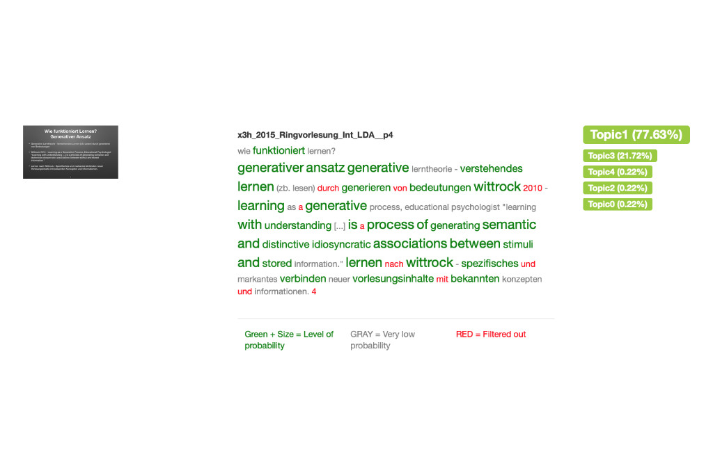 Traditionelle Vorlesungen leiden oft unter einem Mangel an Interaktion zwischen Dozenten und Studierenden. Um dem entgegenzuwirken, konzentrierte sich meine Forschung auf die Analyse von Lernprozessen und die Strukturierung von Lehrmaterialien mittels KI-gesteuerter Methoden. Durch die Integration generativer Lerntheorien, Wissensmanagement und natürlicher Sprachverarbeitung entwickle ich Werkzeuge, um das Lernverhalten der Studierenden zu beobachten und Informationsstrukturen aus unannotierten Bildungsinhalten zu extrahieren. Mittels Topic Modeling und Topic Map Modellen ermöglicht meine Arbeit einen systematischen Vergleich von Lern- und Lehrprozessen. Die entwickelte Software bietet Forschern in der Pädagogik und Psychologie neue Mittel, um die digitale Bildung zu untersuchen und datenbasierte Einblicke in effektive Lehrstrategien zu gewinnen.